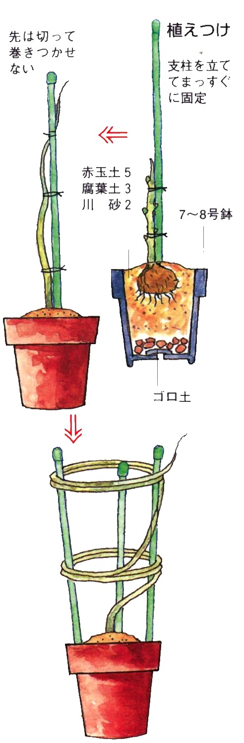 以後、支柱に巻きつかせないように固定して伸ばし、剪定期に先を切りつめます。支柱の先まで伸びたら支柱をはずし、あんどんを立てて巻きつかせます。 |