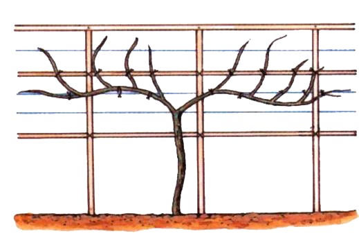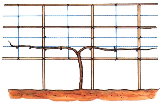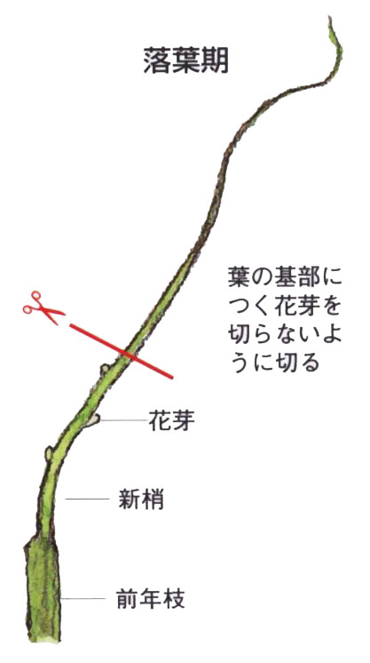 3月上旬に、新梢を2〜3節残して先を切りつめます。庭植え垣根仕立てでは、主枝を2本左右に誘引して固定し、主枝から出る結果枝をバランスよく上に伸ばして固定し、不要枝は整理します。 |