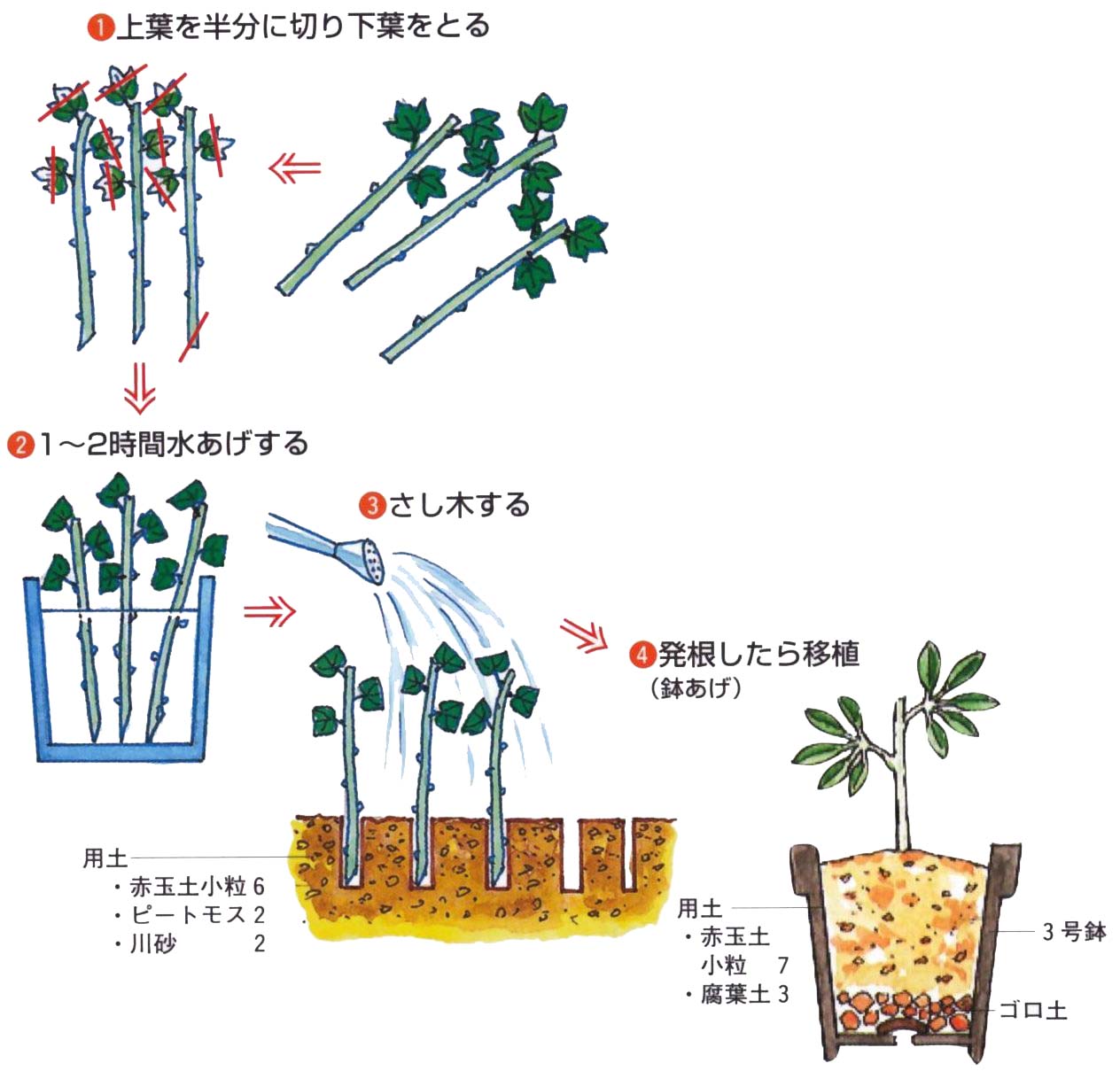 挿し木が一般的です。6月ごろの緑枝ざしで新梢を使います。長さ5〜7cmに切り、上葉は半分に切って残し、下葉を取ります。。1〜2時間水あげして赤玉土小粒6、ピートモス2、川砂2の用土に挿し木します。発根したら3号鉢に赤玉土7、腐葉土3の用土で鉢あげします。 |