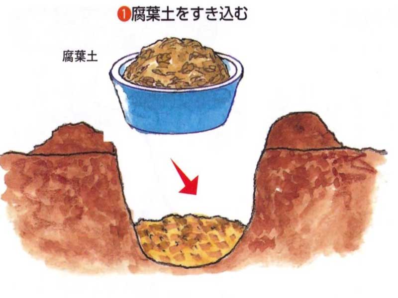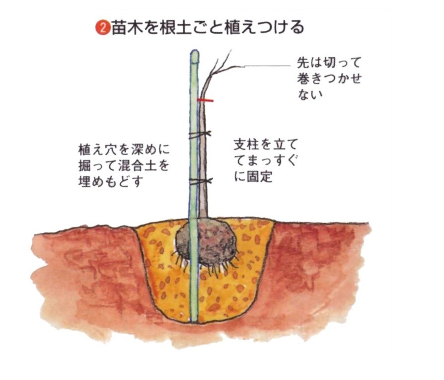 3月いっぱいが植え付けの適期です。深い土層を好むので、植え穴を深めに掘り、腐葉土などをすき込み、埋め戻しておきます。苗木を鉢から抜いて、根土ごと植え付けて水やりします。