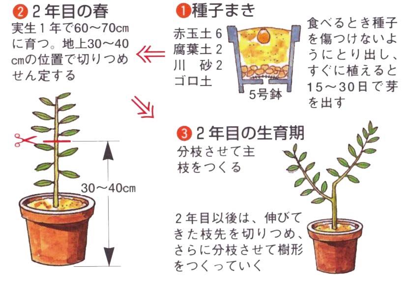 種子まき後1年で、60〜70cmの苗に育ちます。春に高さ30〜40cmに切りつめ、発生した枝で主枝をつくります。剪定は、枯れ枝やヒコバエを間引く程度です。 |
