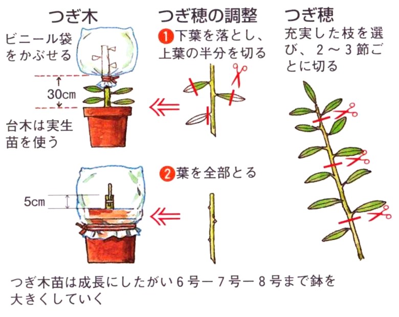 実生苗は性質がはっきりしないので、よい穂木を入手してつぎ木します。実生苗を30cmで切り、つぎ口をあけてつぎ穂をさし込み、形成層を合わせて固定します。活着したら、性質がはっきりしたつぎ木苗ができます。 |