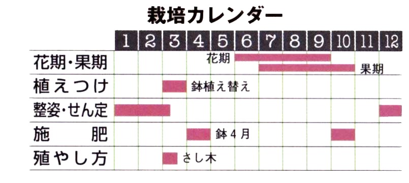 樹形 庭植えは、内部まで日が当たり、手入れしやすい杯状仕立てにして、樹高を2m以下にします。鉢植えは、枝をバランスよく配した自然形に仕立てます。