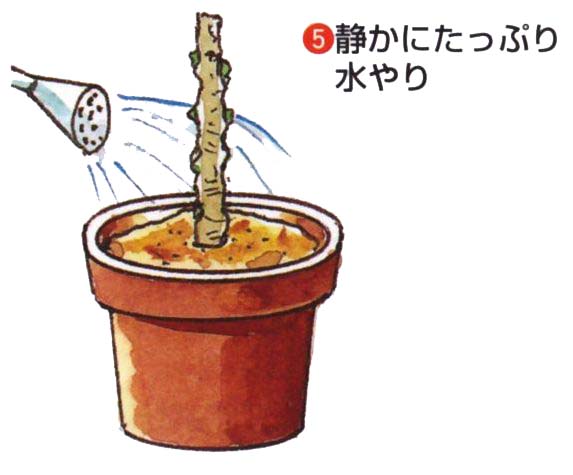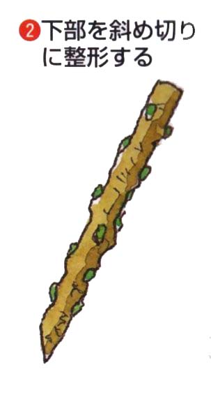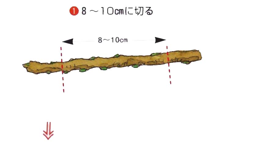 冬季に剪定した1年枝で、節間がつまった充実している枝を貯蔵しておき、3月上〜中旬にさし木します。