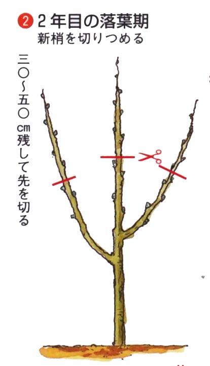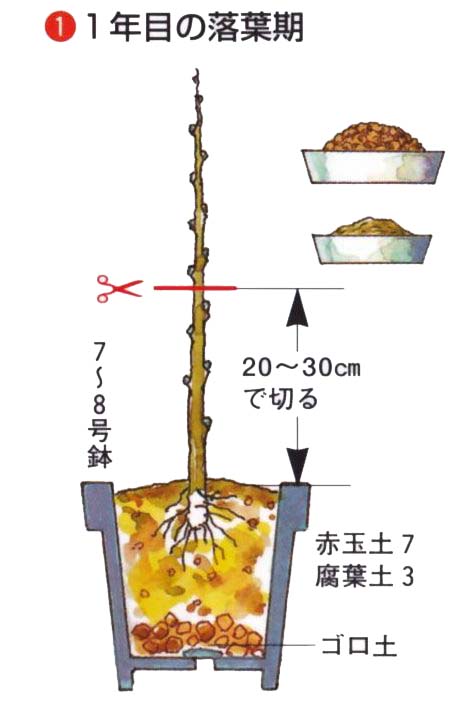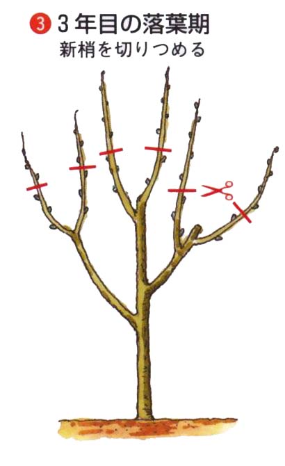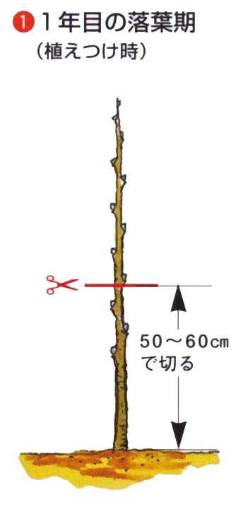植え付け時に、50〜60cmの高さで切りつめ、毎年新梢を切り戻して杯状の樹形をつくります。鉢植えは植え付け時に鉢高の位置で切りつめ、同じように新梢を切り戻します。