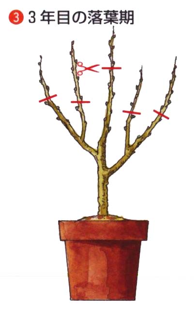 庭植えは3年目、鉢植えは2年目の冬から、2芽残して芽の中間で切りつめる。 |
