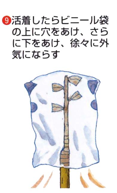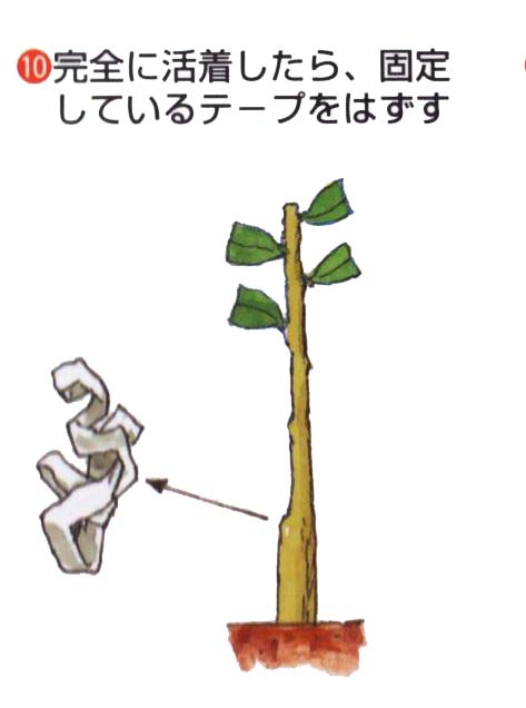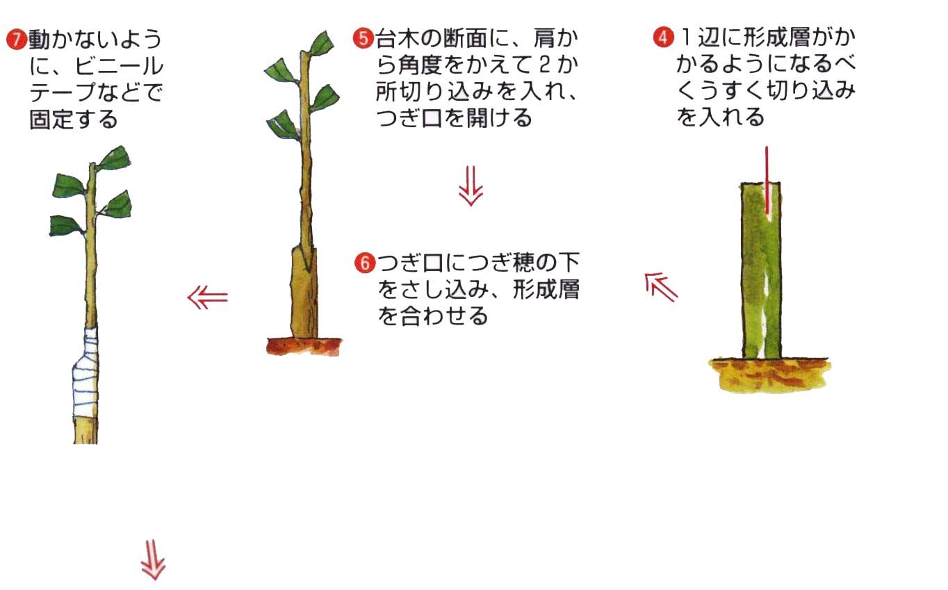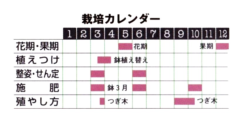 3月下旬と9〜10月上旬が適期です。つぎ木で殖やします。つぎ穂は充実した前年枝で、台木は1〜2年生のカラタチ苗です。