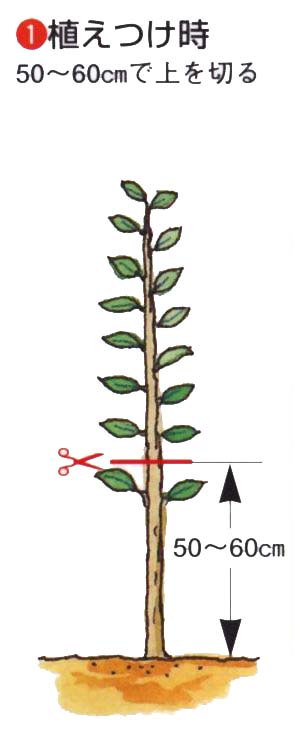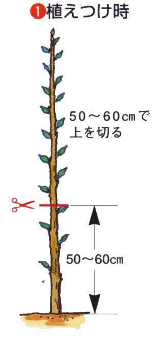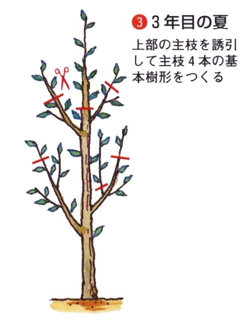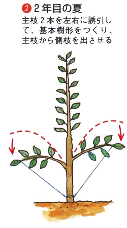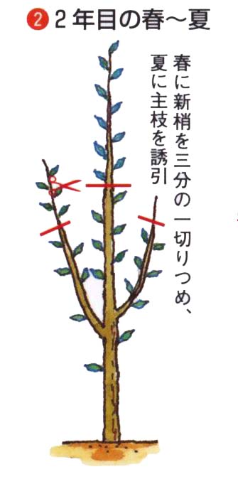 春の3月と夏の6月に行います。延びる枝を切りつめ、込み枝などの不要枝を整理し、生育期に主枝を水平ぐらいまで誘引して固定します。