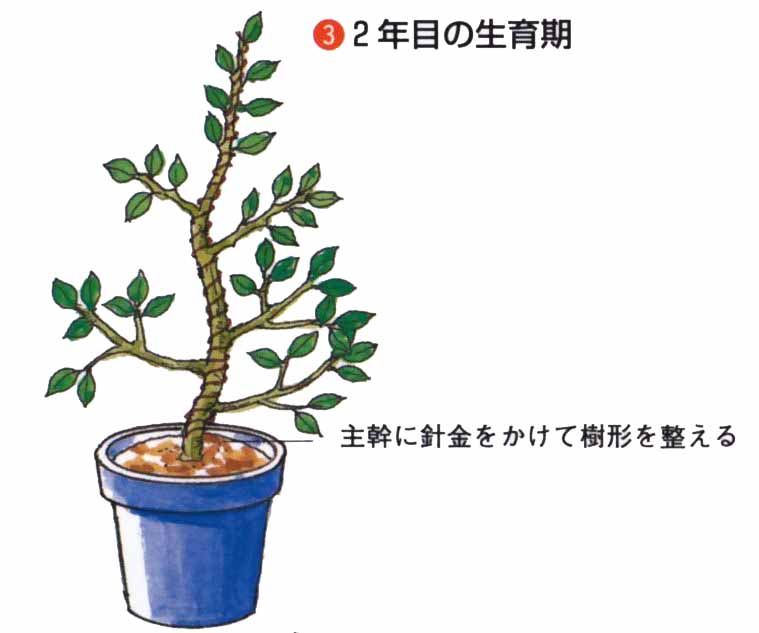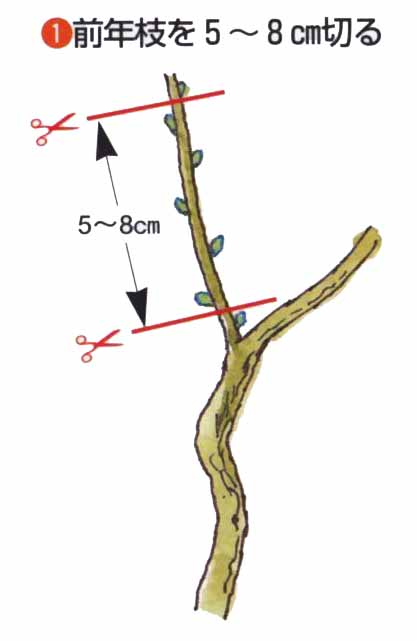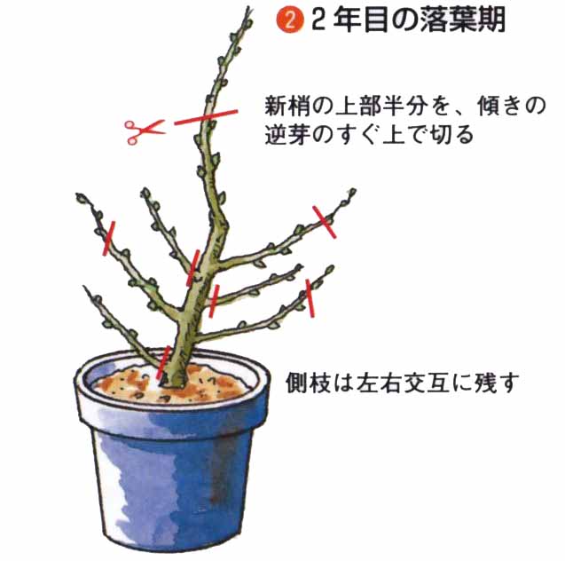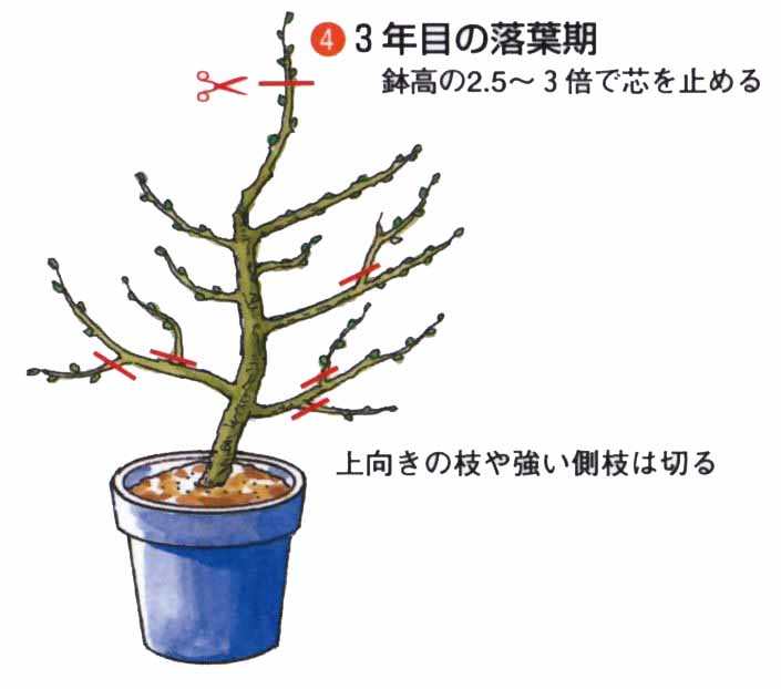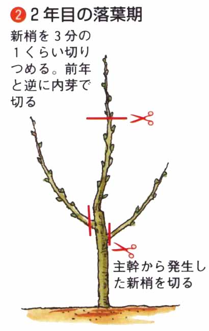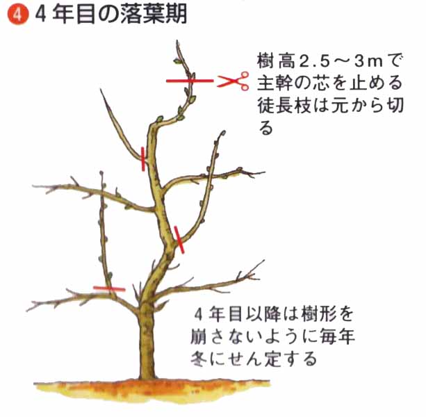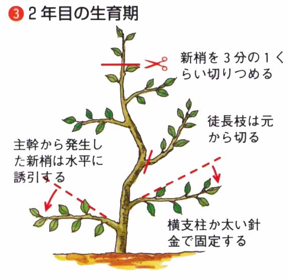 小柄にしたいときは、3m以内で芯を止めます。新梢は、上に向かって強く伸びやすいので、5月中旬〜6月の生育期に、太い針金をかけるか支柱で横向きに固定します。3〜4年で、目的の樹形をつくります。仕立て中に太い徒長枝が発生したら、根元から切り取ります。2年枝に開花結実しますが、長果枝は開花しても結実が少ないので、込み合うようなら、根元から切り取ります。