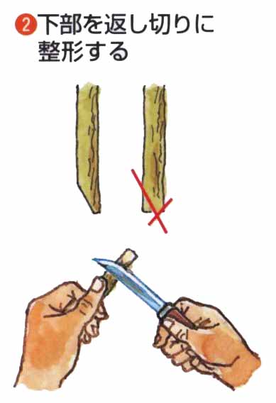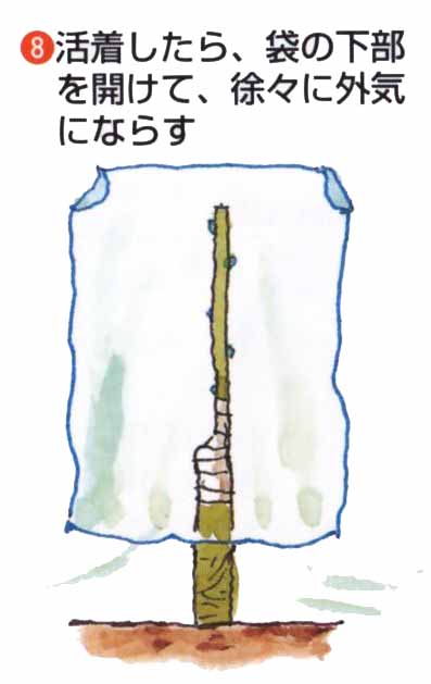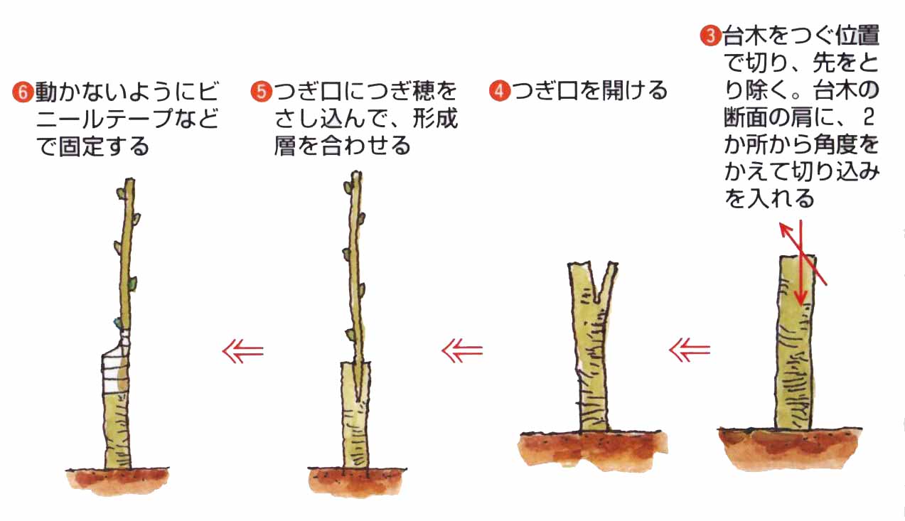 2月中旬〜3月上旬に接木します。台木は2〜3年生の苗木で、接ぎ穂は充実した花芽がない葉芽を3〜4芽つけた前年枝です。
