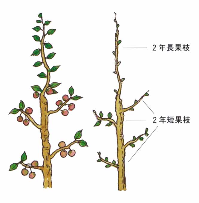 2年枝が開花結実する。短果枝はよく結実するが、長果枝は開花しても結実が少ない。 |