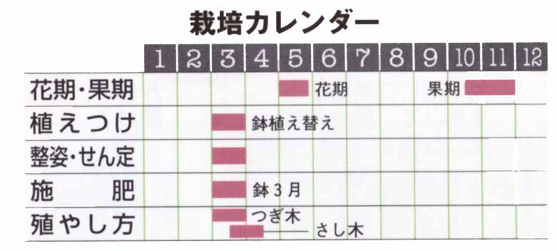 栽培適地 暖地性で雨が少ない気候を好み、生育適温は年間平均気温15〜20℃です。庭植えは関東地方から南が適地になります。日当たりと水はけのよい場所を好みます。日照時間が長いほど良果が収穫できます。 |