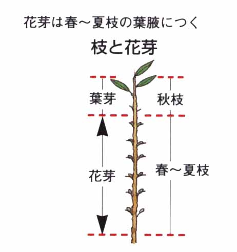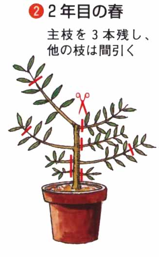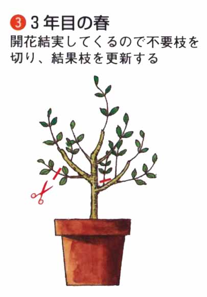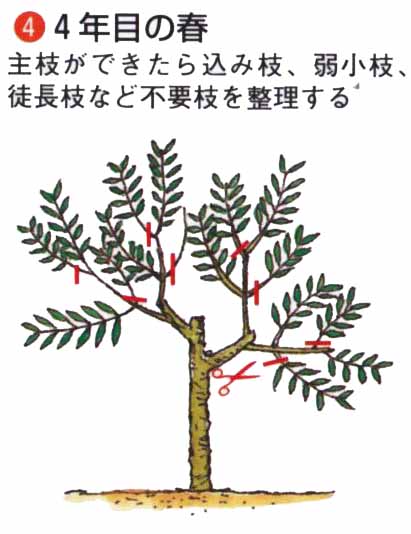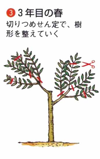 樹形 浅根性で、風に倒されやすいので、樹高2.5mぐらいにおさえ、上部が開いた杯状仕立てにして、内部まで日が当たるようにします。