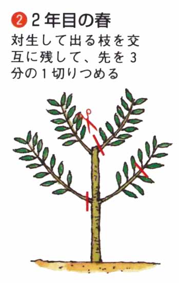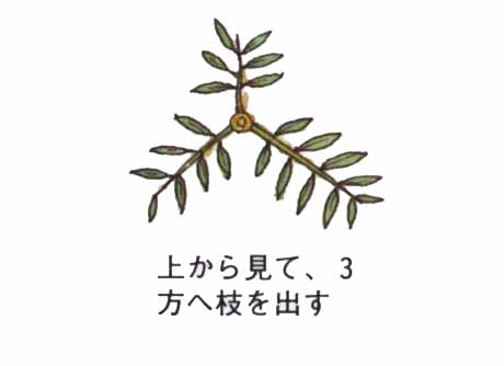 枝を3方に平均に出す、ほうき仕立てに育てます。
