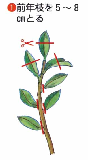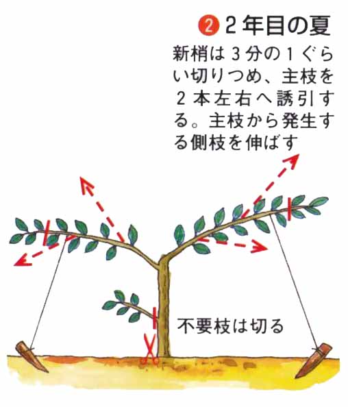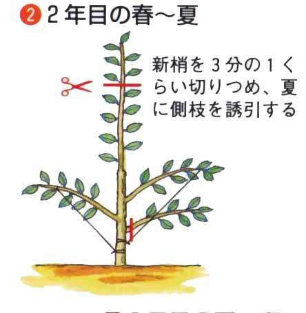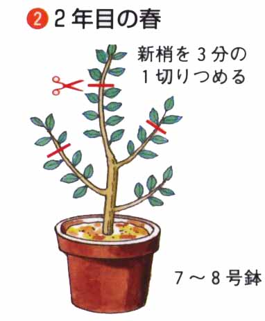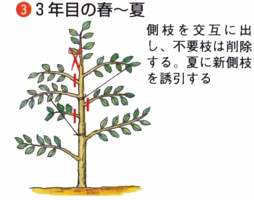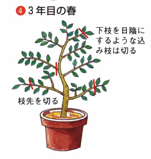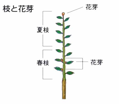 花芽は枝先に付くので、樹形ができたら枝先を不用意に切らないようにします。間引きを主にして、込み枝などを整理します。 |