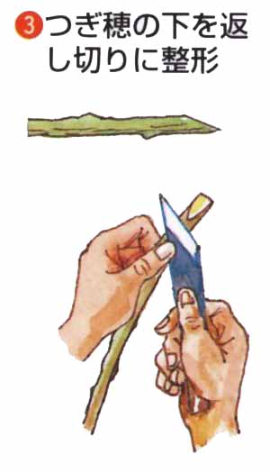 3月下旬につぎ木します。つぎ穂は充実した前年枝で、台木はカラタチの1〜2年生苗木です。