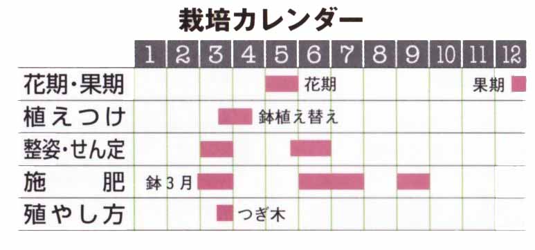 栽培適地 冬暖かく、夏は雨が少なく涼しい地方が生育適地です。日本国内では適地が少なく、太平洋沿岸の一部にしか生産されていませんが、庭植で楽しむ程度なら、範囲はずっと広がり、ウンシュウミカンが育つ地域で、冬の寒風と西日を避ければ十分楽しめます。鉢植えは冬の間室内に入れれば、寒冷地でも育てられますが、マイナス3℃ぐらいが耐寒温度です。 |
