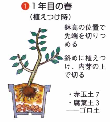 主幹形仕立てや半円形仕立てなど、扱いやすい樹形にします。鉢植えは、模様木仕立てが一般的です。