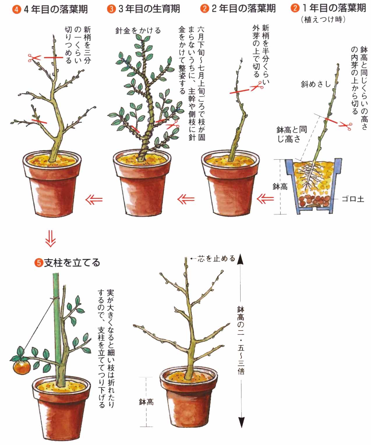 先端に強い枝が伸び、下枝には短枝が発生するので、長い枝を切り、短枝を残します。剪定を繰り返し、目標の高さになったら芯を止めます。その後は樹形を乱す枝を整理して、枝張りをつくります。