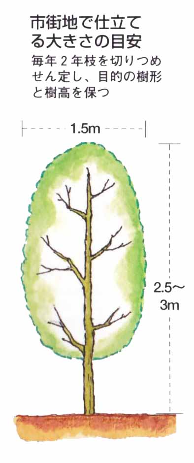 庭植えは、主幹形仕立てにします。本来が高木なので、放置すると大きくなりすぎます。市街地の庭では、高さや枝張りを制限して、庭の広さに合わせた樹形に仕立てます。