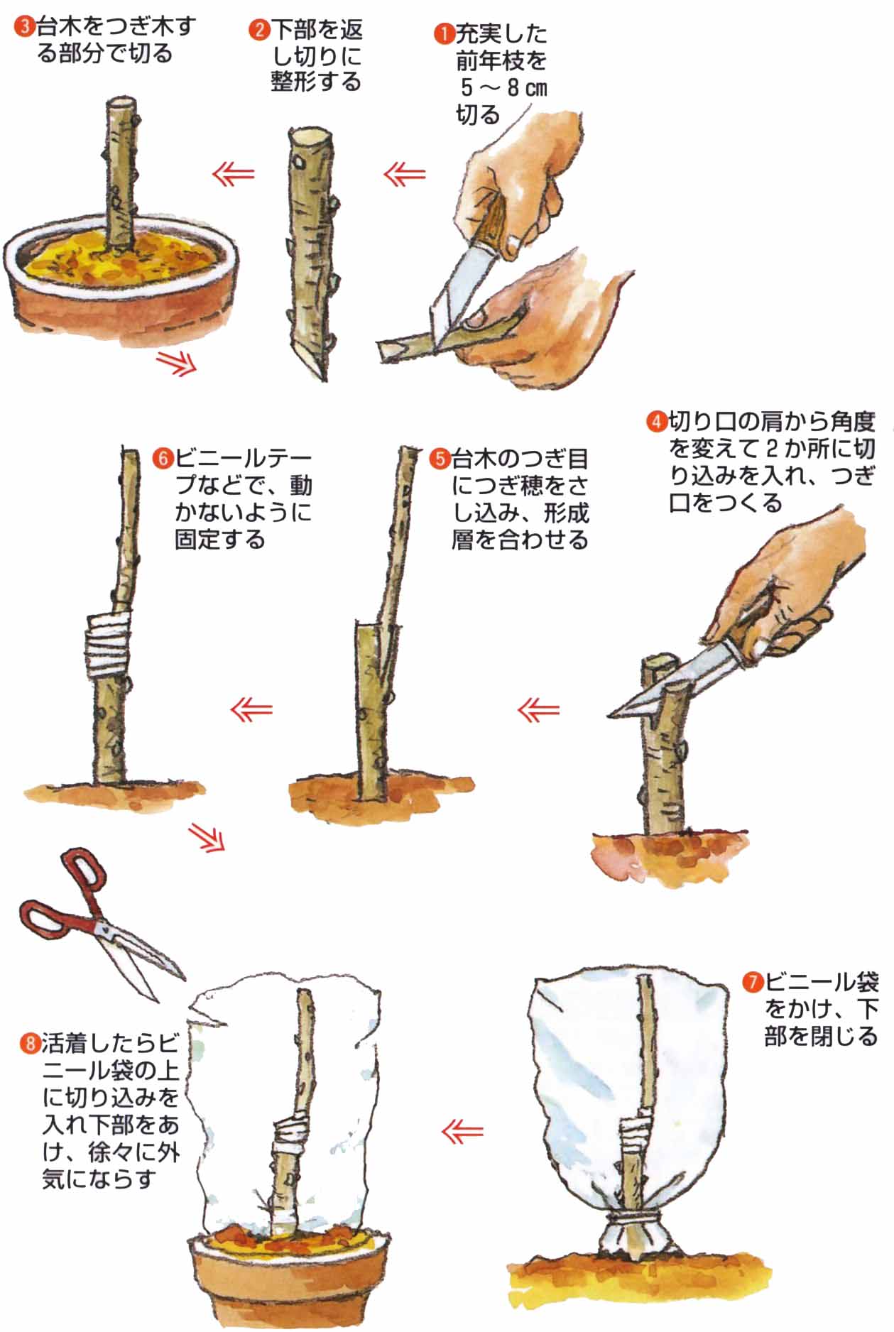 つぎ木で殖やします。甘ガキが欲しいとき、台木は渋ガキでもかまいませんが、つぎ穂には甘ガキを使います。