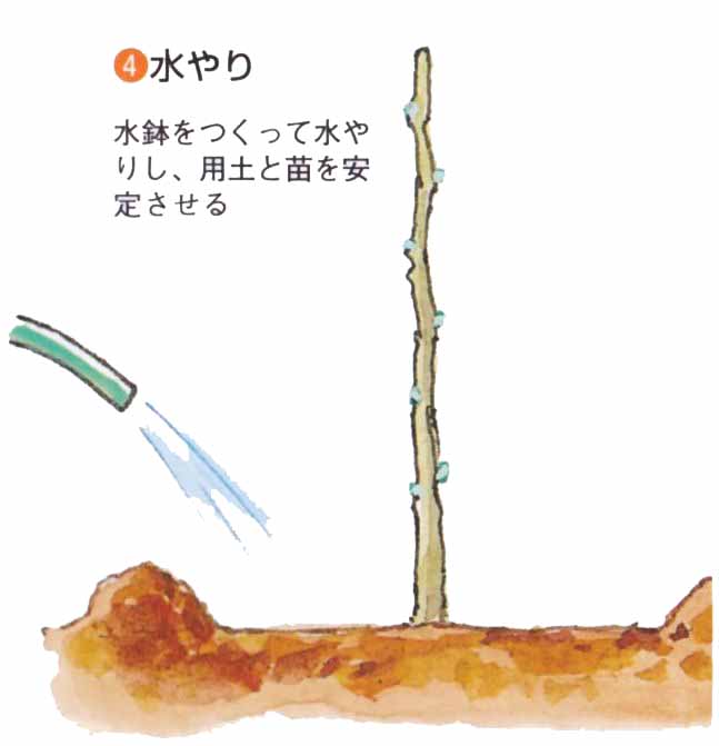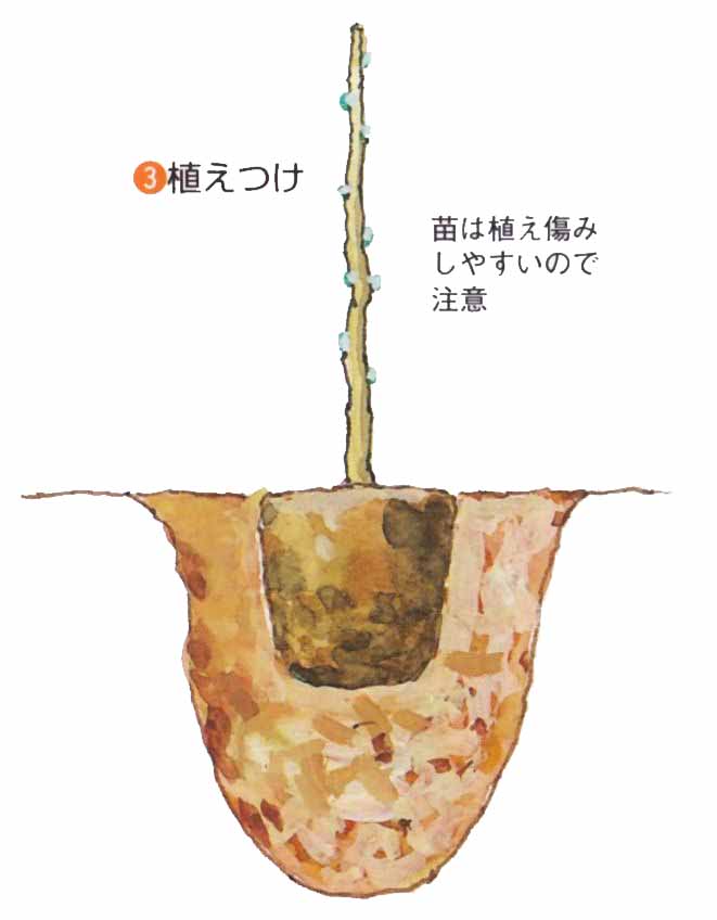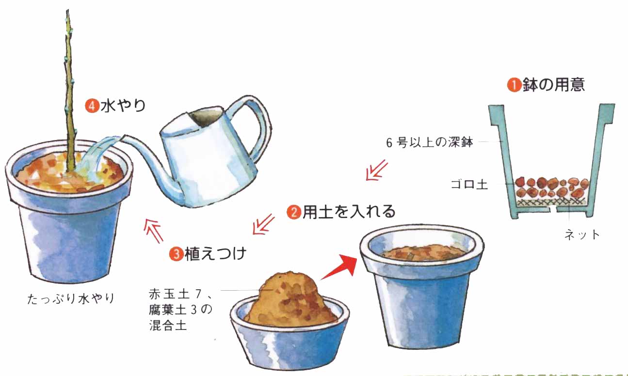 日当たりがよく、深根性なので、土層の深い場所が適地です。乾燥を嫌うので、植穴を深めに掘り、腐葉土を多めにすき込んで、適湿を保ちやすくします。植え付け適期は11月下旬〜2月中旬の落葉期です。植え痛みしやすいので、苗木はていねいに扱います。鉢植えは赤玉土7、腐葉土3の混合土に植えつけます。