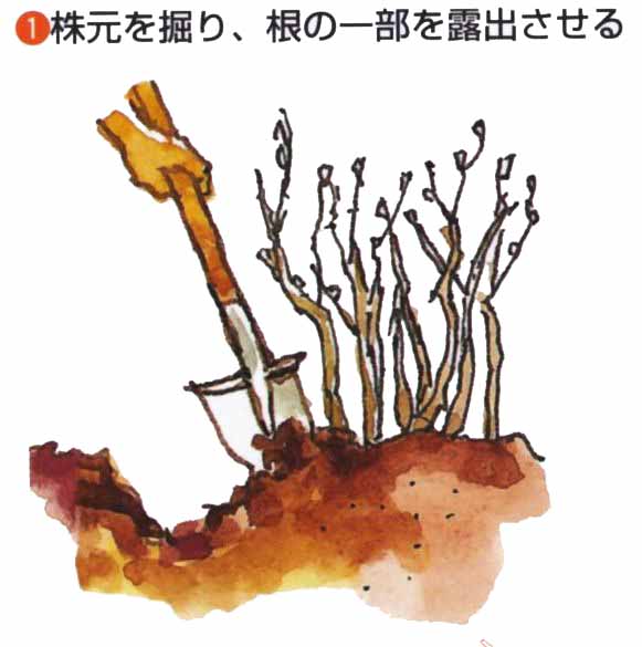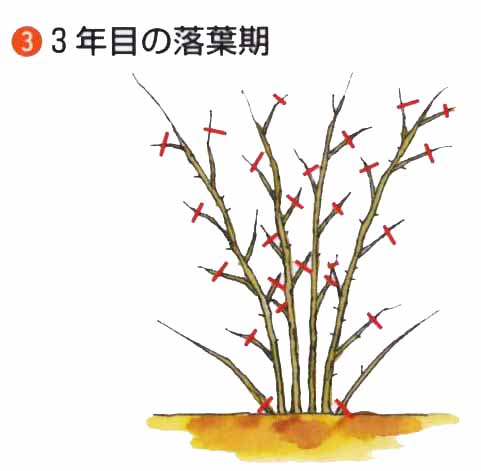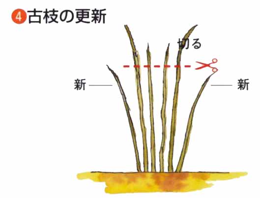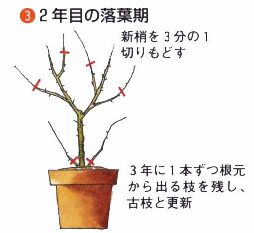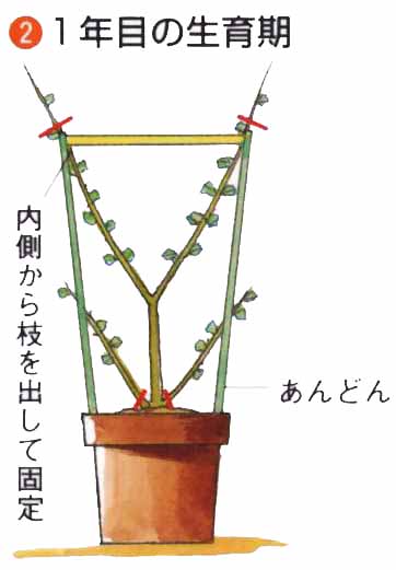 樹形 株立ちになるので、そのまま株立ち仕立てや垣根仕立てにします。垣根仕立ては左右に支柱を立て、1.6mぐらいの高さで針金を張り、根元から出る立枝を誘引して固定します。