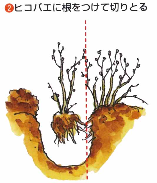 春から夏にかけて、根元から発生するヒコバエを株分けします。
