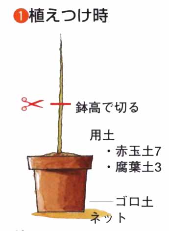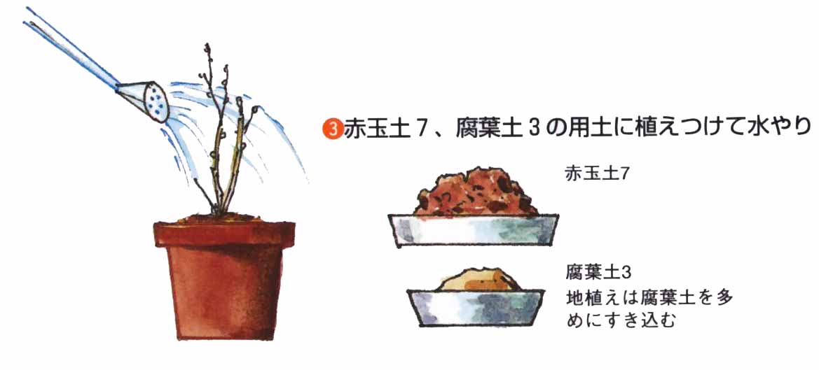 成長開始の前の2〜3月が適期です。根は酸素不足に弱いので、通気性がよい用土を心がけます。