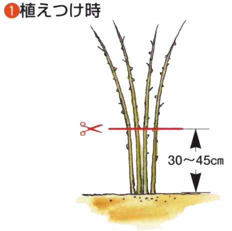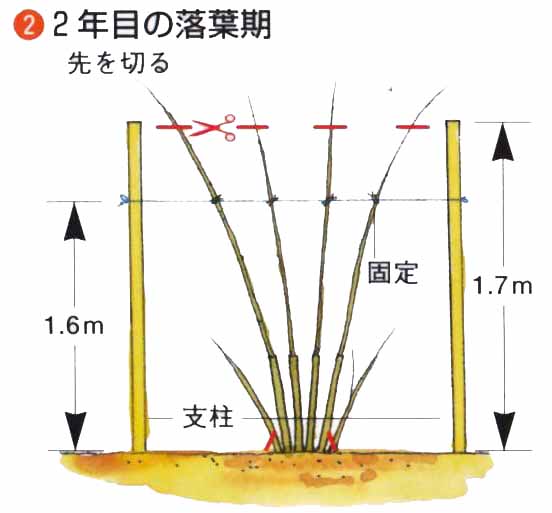 開花結実は新梢の先につき、結実後は枯れるので、毎年結果母枝を更新します。植え付け時に30〜45cmで先を切りつめます。2年目以後は立枝数をきめて更新しながら、その他の枝は根ぎわから切ります。1〜2月の休眠期に、1.7mぐらいに先を切りもどします。