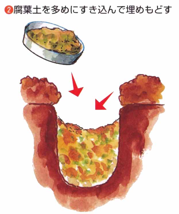 1〜2月に、根回りに配合肥料を2〜3握りばらまき、軽くすき込みます。鉢植えは3月に、固形肥料(大粒)を3〜4粒置肥します。
