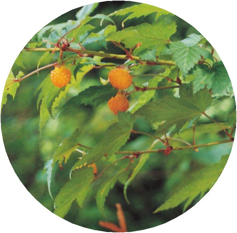 本州中南部、四国の太平洋沿岸の暖地に自生するキイチゴの一種。高さは約2mの株立ちになります。葉は3〜7裂し、カジノキの葉に似ています。4〜5月にかけて白花が咲き、秋には淡黄色の果実が熟します。新芽や紅葉も美しい。国内には、西日本の暖地に自生する常緑つる性のフユイチゴがあります。高さ20〜30cmと低く、10月開花で冬に赤果が熟します。