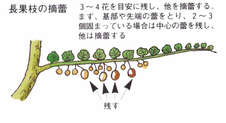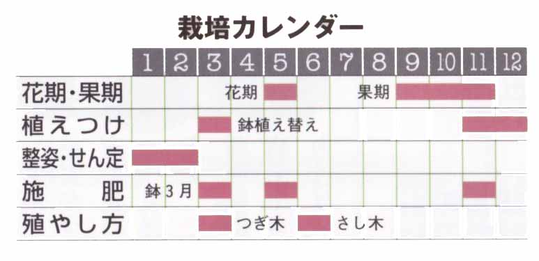 寒さには強いのですが、果実が成熟する9〜11月には気温が高いほうがよいので、関東地方以西が適地になります。日当たりがよく土層が深い場所で、風通しがよいことも必要ですが、新梢が伸びる春に強い季節風にあたると、風害を起こすので注意します。 |