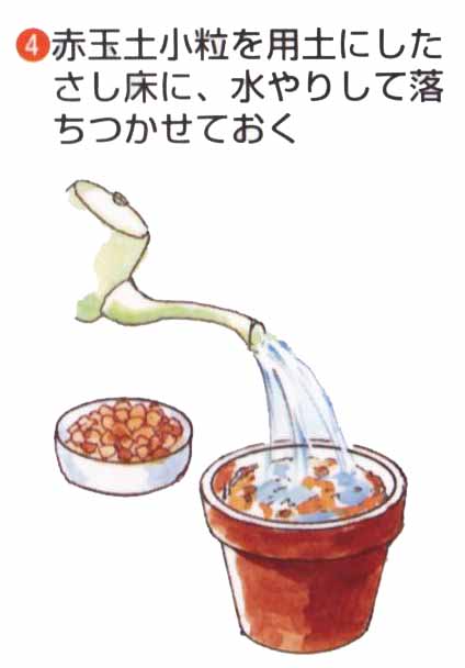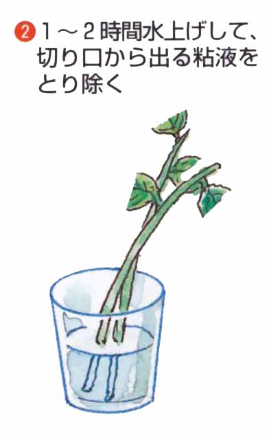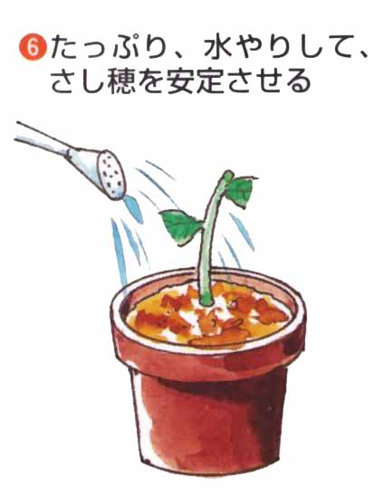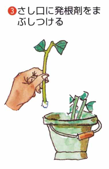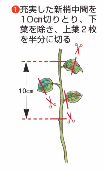 前年枝の休眠ざしやつぎ木もできますが、簡単で活着がよいのは、今年枝の緑枝ざしです。かたい枝元や軟弱な先を除き、中間の茎を使います。