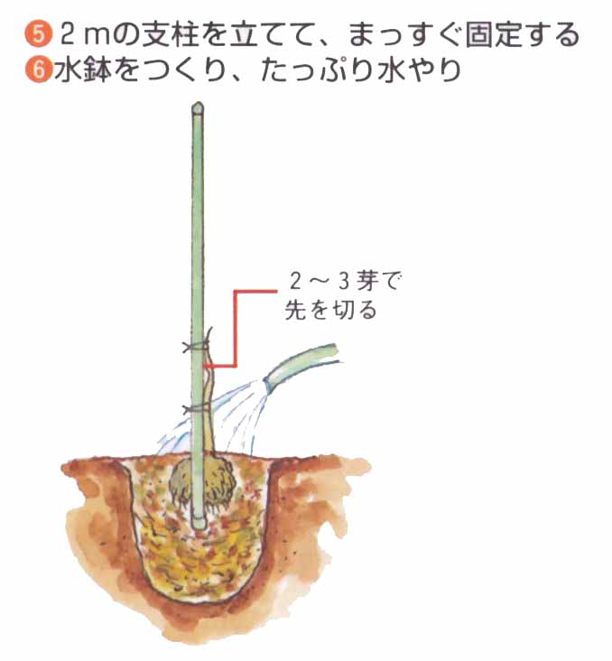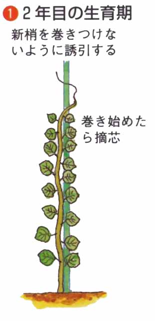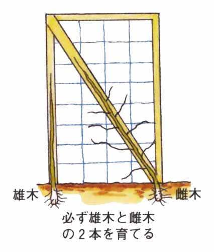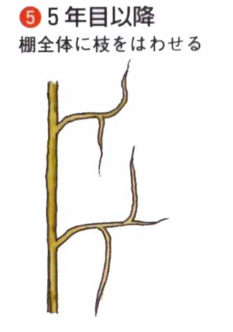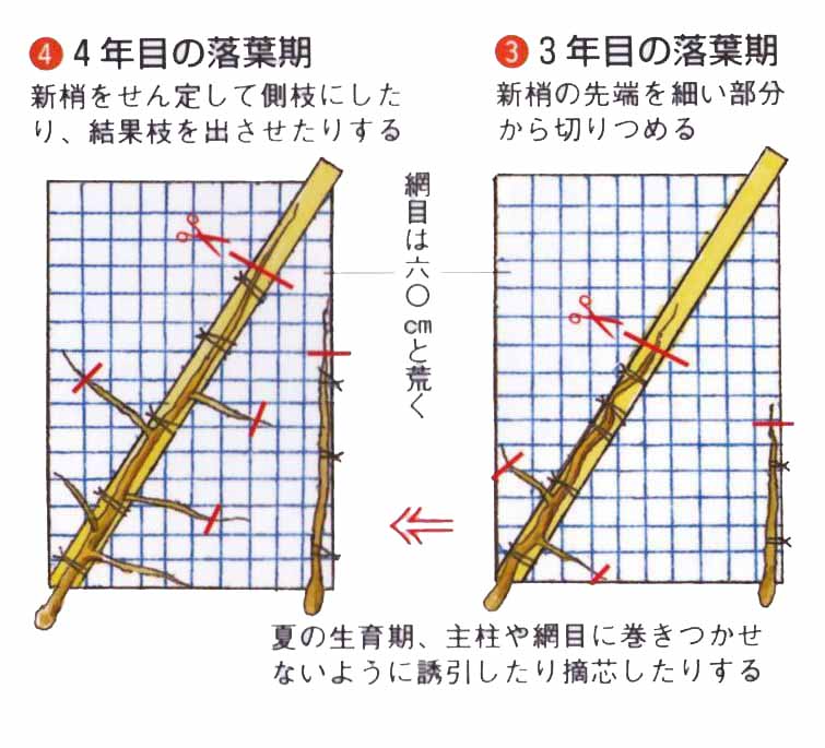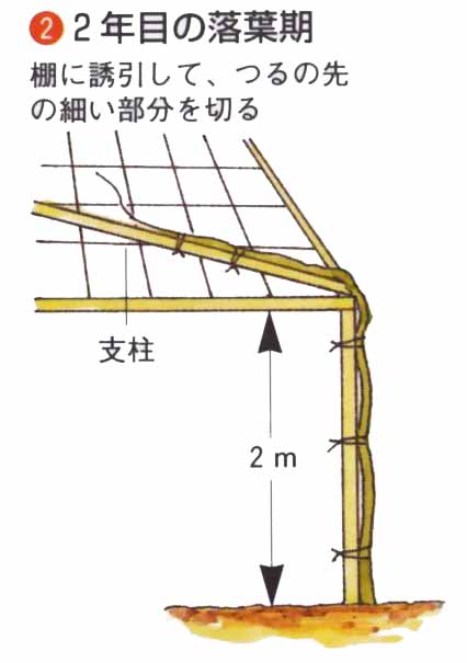 2年目の落葉期に、棚をつくります。棚は高さ2m、網目60cmで、苗木を棚の一角にして対角線に向かって支柱を棚上に一本固定します。主つるを支柱に固定して伸ばし、側枝や結果母枝を左右平均に配し、棚上全体につるが伸びたら、内部までよく日が入るように、剪定や誘引をします。
