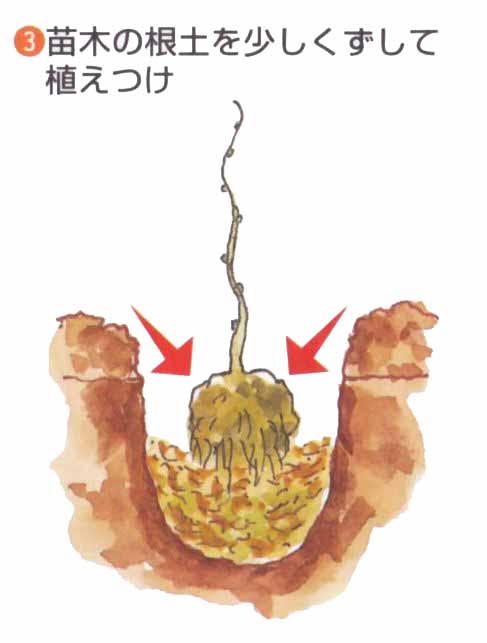 肥料を欲しがる果樹なので、3月、5月、11月の年3回与えます。配合肥料を根回りに3〜4握りばらまき、軽くすき込みます。11月の施肥のとき、根回り全体に石灰を散布しておくと土質の酸化を防ぎ、カルシウムの補給になります。